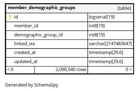 | idx_member_demographic_groups_on_member_group_via | Must be unique | Asc/Asc/Asc | member_id + demographic_group_id + linked_via |
